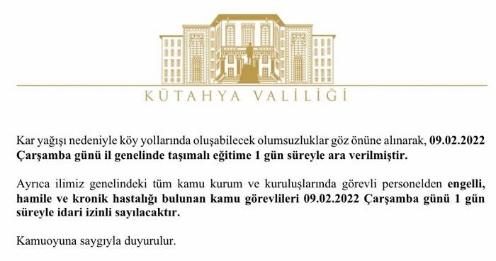 Kütahya Valiliğinden yapılan açıklamada, kar yağışı nedeniyle köy yollarında oluşabilecek olumsuzluklar göz önüne alınarak il genelinde taşımalı eğitim gören öğrenciler için 9 Şubat Çarşamba günü eğitim ve öğretime bir gün ara verildiği belirtildi.