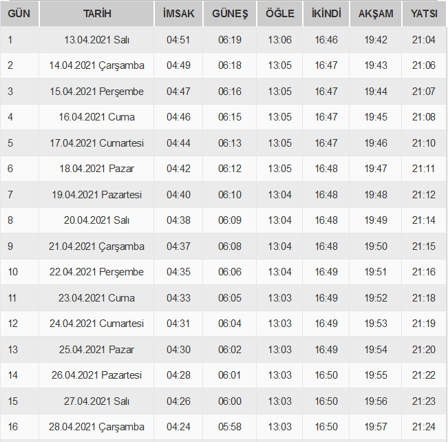 Diyanet Kütahya İmsakiyesi 2021