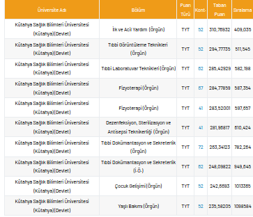 Kütahya Sağlık Bilimleri Üniversitesi 2021 taban puanları ve yüzdelik dilimleri