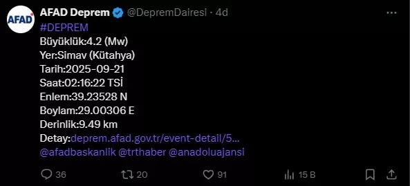 Afet ve Acil Durum Yönetimi Başkanlığı (AFAD) verilerine göre, Kütahya'nın Simav ilçesi merkezli bir deprem meydana geldi. Saat 02.16'da gerçekleşen sarsıntının büyüklüğü 4,2 olarak ölçülürken, derinliği ise 9.49 kilometre olarak belirlendi.