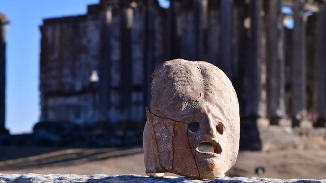 Kütahya'nın Çavdarhisar ilçesindeki arkeolojik kazıda, Aizanoi Antik Kenti'ne girişi sağlayan anıtsal kapı yapısı ile 2 bin yıl öncesine ait pişmiş topraktan yapılmış tiyatro maskı bulundu...