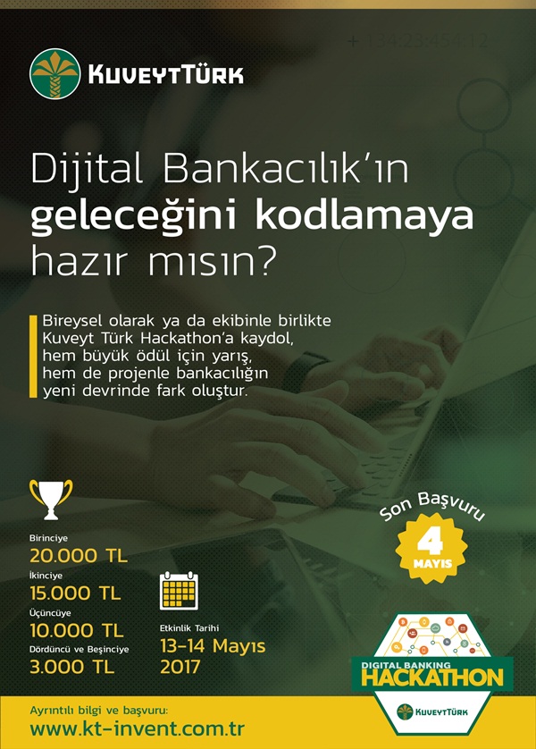 Kuveyt Türk, 13-14 Mayıs tarihleri arasında ‘Dijital Bankacılık’ konusunda düzenleyeceği yarışmada dereceye giren kişi veya takımlara toplamda 45 bin TL’lik ödül verecek. Katılımcıların yarışma süresince yazılım fikirlerini kodlayarak hayata geçirecekleri ve rekabet edecekleri ‘Hackathon’ organizasyonu, Kuveyt Türk’ün bu alanda gerçekleştireceği ilk etkinlik olma özelliği taşıyor.