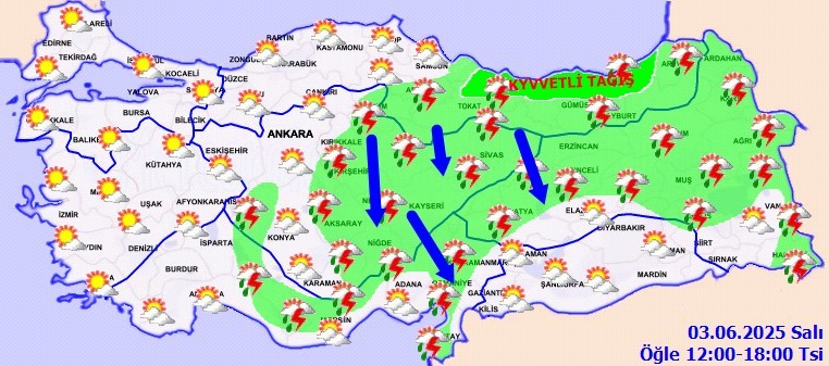 Meteoroloji Genel Müdürlüğü, yurdun iç ve doğu bölgelerinde kuvvetli sağanak ve fırtına beklendiğini açıkladı. Karadeniz’in doğusunda şiddetli yağış, İç Anadolu ve Doğu Akdeniz’de ise sert rüzgar etkili olacak. Yetkililer, vatandaşları sel, su baskını ve ulaşımda aksamalar gibi olumsuzluklara karşı dikkatli ve tedbirli olmaya çağırdı.