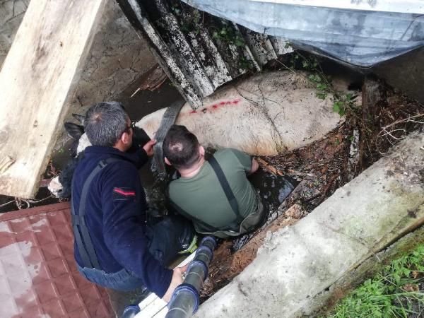 Kocaeli'nin Gölcük ilçesinde, evin bahçesindeki 3 metre derinliğindeki kuyuya düşen ineği, itfaiye halatla bağlayıp yukarı çekerek kurtardı.