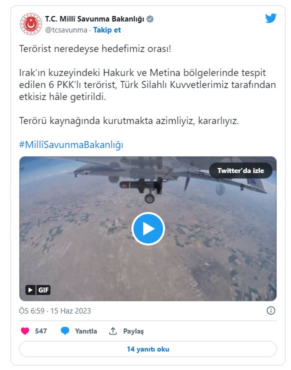 MSB'den yapılan açıklamada 'Irak’ın kuzeyindeki Hakurk ve Metina bölgelerinde tespit edilen 6 PKK'lı terörist, Türk Silahlı Kuvvetlerimiz tarafından etkisiz hâle getirildi.' ifadeleri yer aldı.