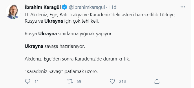 Gazeteci yazar İbrahim Karagül konuyla ilgili yaptığı açıklamada, "D. Akdeniz, Ege, Batı Trakya ve Karadeniz’deki askeri hareketlilik Türkiye, Rusya ve Ukrayna için çok tehlikeli. Rusya Ukrayna sınırlarına yığınak yapıyor. Ukrayna savaşa hazırlanıyor. Akdeniz, Ege'den sonra Karadeniz'de durum kritik. "Karadeniz Savaşı" patlamak üzere." dedi.