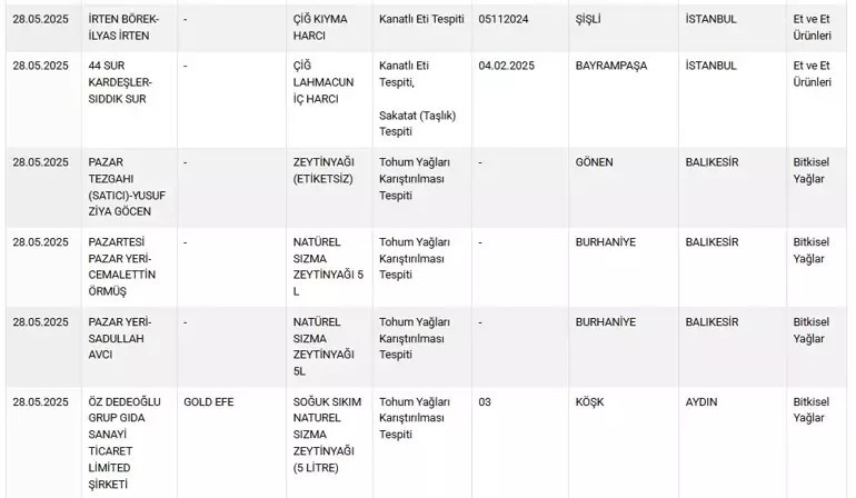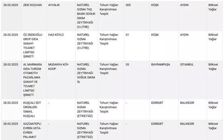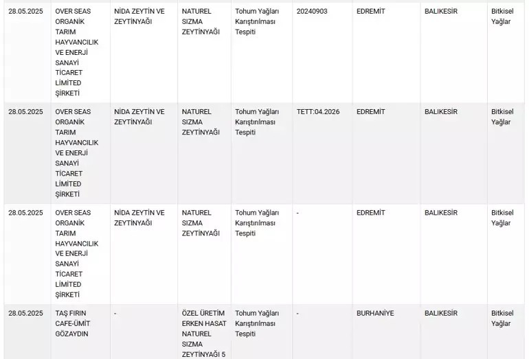 Listede yalnızca lahmacun değil, zeytinyağından yoğurda kadar pek çok ürün yer alıyor. 15 farklı firmanın zeytinyağına daha ucuz tohum yağlarının karıştırıldığı belirlenirken, İzmir Dikili’de üretim yapan bir firma ise bitkisel yağa yasaklı boya ekleyerek sahtekârlıkta sınır tanımadı. Bu madde, gıdalarda kullanımı kesinlikle yasak olan bir kimyasal!