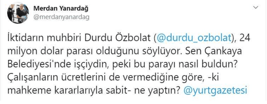 CHP eski milletvekili, PM üyesi ve Yurt Gazetesi’nin sahibi Durdu Özbolat’ın Merdan Yanardağ hakkındaki, “Tele 1’in kaynağını açıklamazsan sana sorarım; kaynak benden çaldığın paralar mı yoksa Akın İpek’ten aldıkların mı? Barış TV’yi satarak aradan aldığın komisyonla Tele1’i kurdun, Barış TV’yi kime sattın?” sözleri gündemdeki tazeliğini korurken, bu sözlere cevap veren Amerikancı Yanardağ, Özbolat’ın geçmişte Çankaya Belediyesi’nde işçi olarak çalıştığını hatırlattı ve gazete kuracak parayı nereden bulduğunu sordu.