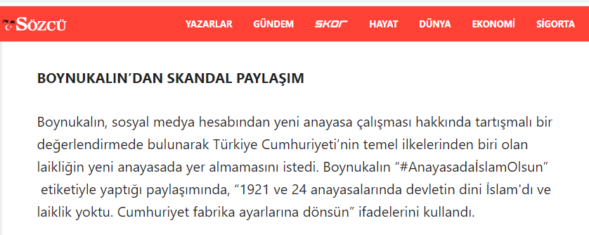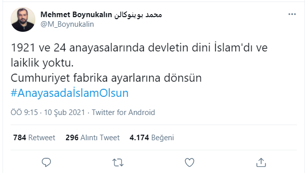 Ayasofya-i Kebir Camii Baş İmamı Prof. Dr. Mehmet Boynukalın, twitter hesabından paylaşımda bulundu. Prof. Boynukalın, "1921 ve 24 anayasalarında devletin dini İslam’dı ve laiklik yoktu. Cumhuriyet fabrika ayarlarına dönsün." dedi.