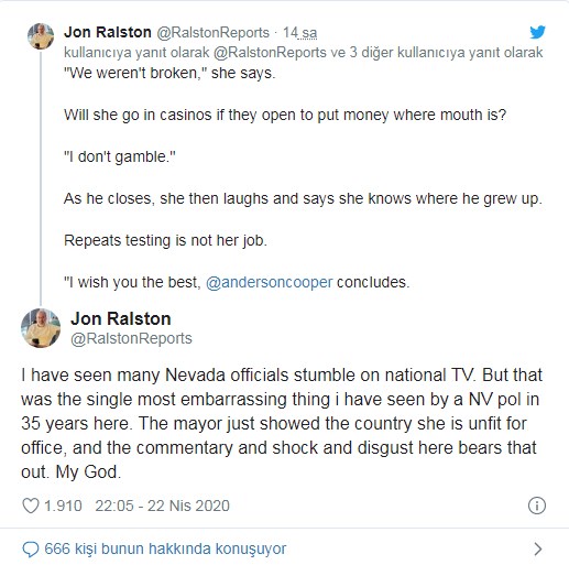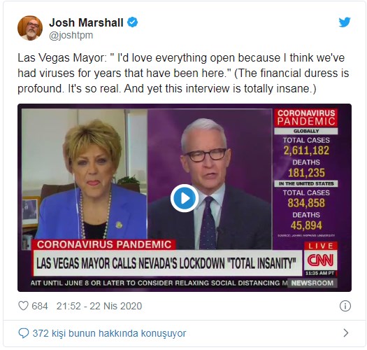 Cooper’ın bir hayli şaşırdığı görülürken konuşmasına devam eden Goodman, “Her şeyin açık olmasını istiyorum çünkü bence burada yıllardır virüsler var. Las Vegas kentinde açık olmamızı istiyorum ki insanlarımız işlerine dönebilsin” ifadelerini kullandı.