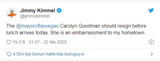 Ünlü talk şov sunucusu Jimmy Kimmel de Carolyn Goodman’ın kent için bir ‘utanç’ olduğunu belirtti ve “Öğle yemeği gelmeden istifa etmeli” dedi.