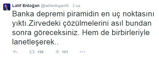YENİAKİT.COM.TR - Yıllarca Fetullah Gülen'in çok yakınında bulunmuş, daha sonra ayrılmış olan Latif Erdoğan TMSF'nin el koyduğu Bank Asya ile ilgili flaş bir iddiada bulundu. Latif Erdoğan, bugün Twitter hesabı üzerinden yaptığı açıklamada, banka depreminin piramidin en uç noktasını yıktığını söyleyerek, "Zirvedeki çözülmelerini asıl bundan sonra göreceksiniz. Hem de birbirleriyle lanetleşerek" ifadelerini kullandı.