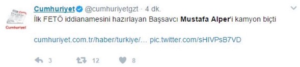 Cumhuriyet gazetesi Başsavcı'nın şehit olduğu haberi okurlarına "İlk FETÖ iddianamesini hazırlayan Başsavcı Mustafa Alper'i kamyon biçti" başlığıyla duyurduğu andan itibaren FETÖ'cü hesapların dışında birçok vatandaştan yoğun tepki aldı. Bir süre sonra 'biçti' ifadesini haberinden ve twitter hesabından kaldıran Cumhuriyet bu kez de 'Feci şekilde can verdi.' yazdı.