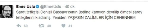 FETÖ firarisi Emre Uslu ise sosyal medya hesabından insanlık dışı tweetle haberi böyle duyurdu: