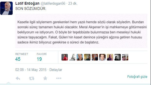 Erdoğan, twitter hesabından 'Son sözüm' başlığıyla paylaştığı mesajında, "Kasetle ilgili söylemem gerekenleri hem yazılı hem de sözlü olarak söyledim. Bundan sonraki süreç tamamen hukuki olacaktır" dedi.