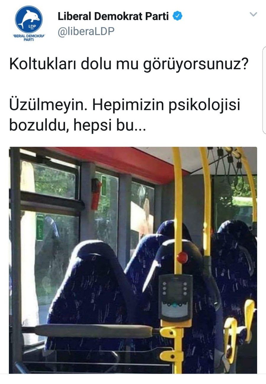Twitter'dan boş otobüs koltuklarının fotoğrafını paylaşan LDP, "Koltukları dolu mu görüyorsunuz? Üzülmeyin. Hepimizin psikolojisi bozuldu, hepsi bu..." ifadelerini kullandı.