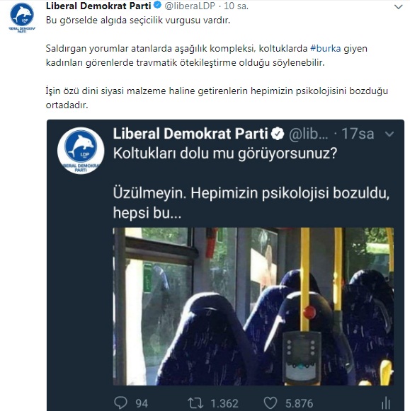 LDP, gelen tepkiler üzerine "Bu görselde algıda seçicilik vurgusu vardır. Saldırgan yorumlar atanlarda aşağılık kompleksi, koltuklarda burka giyen kadınları görenlerde travmatik ötekileştirme olduğu söylenebilir. İşin özü dini siyasi malzeme haline getirenlerin hepimizin psikolojisini bozduğu ortadadır." şeklinde pişkin bir açıklama daha yaparak tepkileri yumuşatmaya çalıştı.