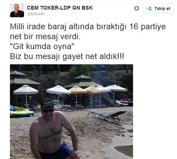 Toker, "Milli irade baraj altında bıraktığı 16 partiye net bir mesaj verdi. 'Git kumda oyna'. Biz bu mesajı gayet net aldık!" diye yazdı ve plaj fotoğrafını paylaştı.