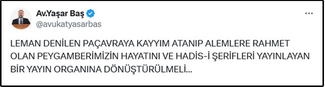 Hukukçular Birliği Vakfı Genel Başkanı Avukat Yaşar Baş, “Leman denilen paçavraya kayyım atanıp, alemlere rahmet olan peygamberimizin hayatını ve hadis-i şerifleri yayınlayan bir yayın organına dönüştürülmeli…” dedi.