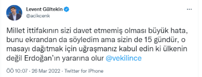 Son mesajında karın ağrısı ortaya çıkan Gültekin, "Millet ittifakının sizi davet etmemiş olması büyük hata, bunu ekrandan da söyledim ama sizin de 15 gündür, o masayı dağıtmak için uğraşmanız kabul edin ki ülkenin değil Erdoğan’ın yararına olur." ifadeleri ile tartışmanın boyutunu değiştirdi.
