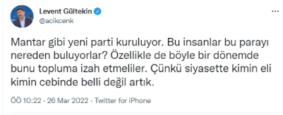Levent Gültekin, Twitter hesabından Muharrem İnce'nin eleştirisine, "Mantar gibi yeni parti kuruluyor. Bu insanlar bu parayı nereden buluyorlar? Özellikle de böyle bir dönemde bunu topluma izah etmeliler. Çünkü siyasette kimin eli kimin cebinde belli değil artık." sözleri ile karşılık verdi.