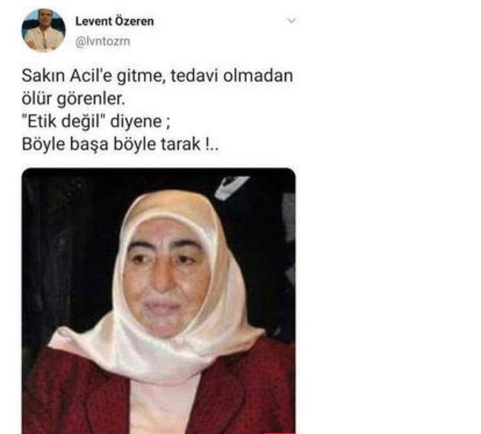 Levent Özeren sosyal medya hesabından "Sakın acile gitme, tedavi olmadan ölür görenler. 'Etik değil' diyene bak, böyle başa böyle tarak!" paylaşımında bulundu.