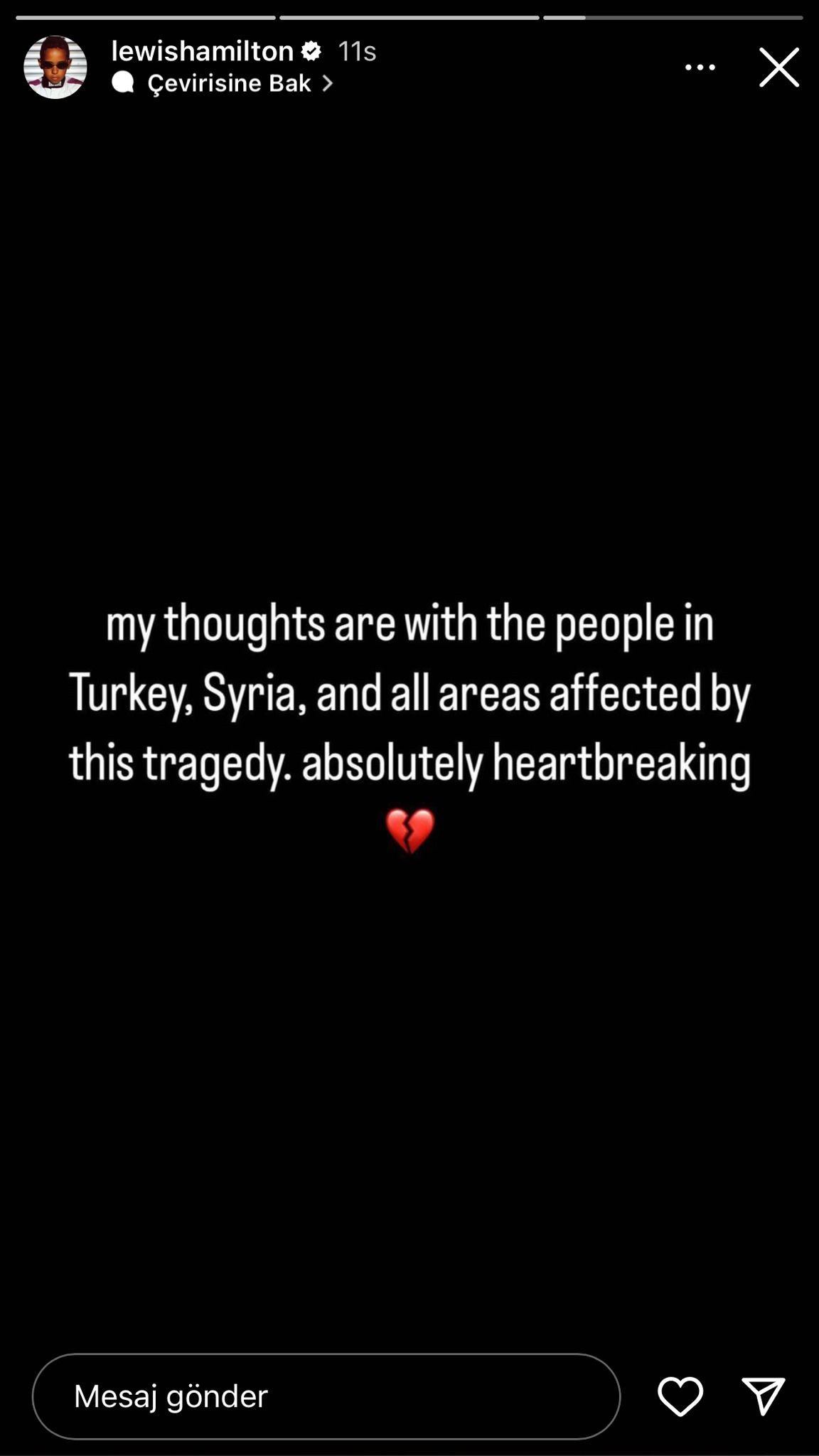 Formula 1 pilotu Lewis Hamilton, Türkiye'de ve Suriye'de yaşanan depremlerin ardından sosyal medya hesabından yaptığı paylaşımla destek mesajı gönderdi. Hamilton paylaşımında, üzüntü duyduğunu ifade etti.