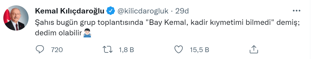 LGBT’lilere verdiği destek nedeniyle LGBT’liler tarafındna ‘Fahri üye’ ilan edilen Kılıçdaroğlu, Erdoğan’ın sözlerine sosyal medya hesabından yaptığı tepki çeken bir paylaşımla cevap verdi. Eşcinsel voleybolcu Ebrar Karakurt’un bir dönem kullandığı, “Dedim olabilir” şeklindeki sözünü Erdoğan için kullanan Kılıçdaroğlu, “Şahıs bugün grup toplantısında "Bay Kemal, kadir kıymetimi bilmedi" demiş; dedim olabilir” diye yazdı.