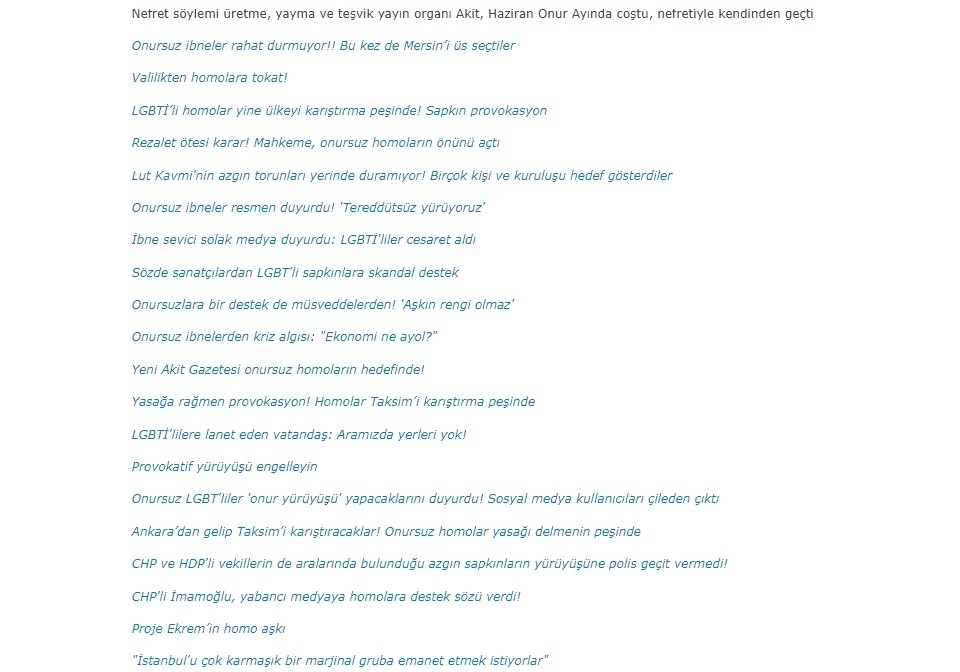 Lut Kavmi'nin artıkları Akit Medya Grubu için, "Nefret söylemi üretme, yayma ve teşvik yayın organı Akit, Haziran Onur Ayında coştu, nefretiyle kendinden geçti." ifadelerine yer vererek rezilliklerini örtbas etmeye çalıştı.