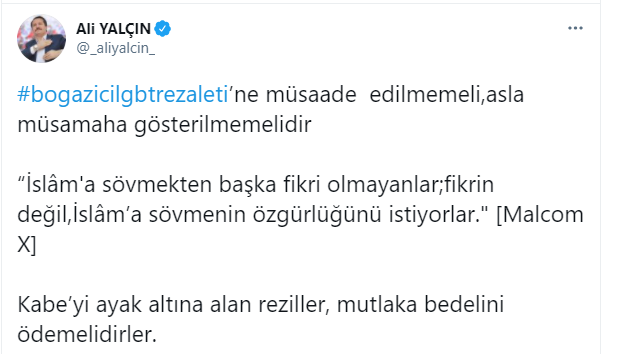 Malcom X'in, "İslâm'a sövmekten başka fikri olmayanlar; fikrin değil, İslâm’a sövmenin özgürlüğünü istiyorlar." sözünü hatırlatan Memur-Sen Başkanı Ali Yalçın da "Boğaziçi LGBTİ rezaletine müsaade edilmemeli, asla müsamaha gösterilmemelidir. Kabe’yi ayak altına alan reziller, mutlaka bedelini ödemelidirler." diye konuştu.