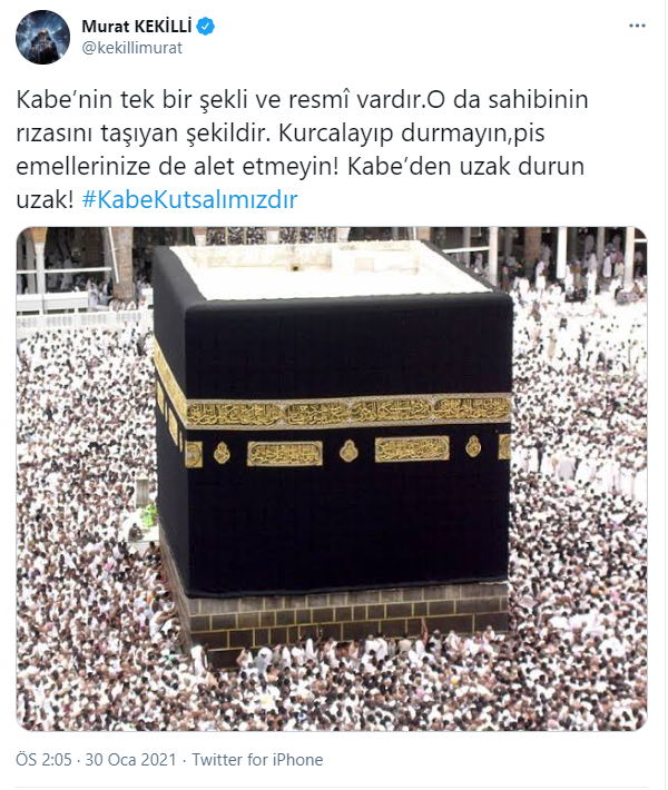 "Kabe’nin tek bir şekli ve resmî vardır. O da sahibinin rızasını taşıyan şekildir." diyen Sanatçı Murat Kekilli, "Kurcalayıp durmayın, pis emellerinize de alet etmeyin. Kabe’den uzak durun uzak." ifadelerini kullandı.