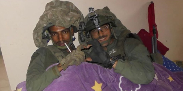 Gazze'de girdikleri bir evde iki siyonist asker, aşağılık bir fotoğraf paylaştı.