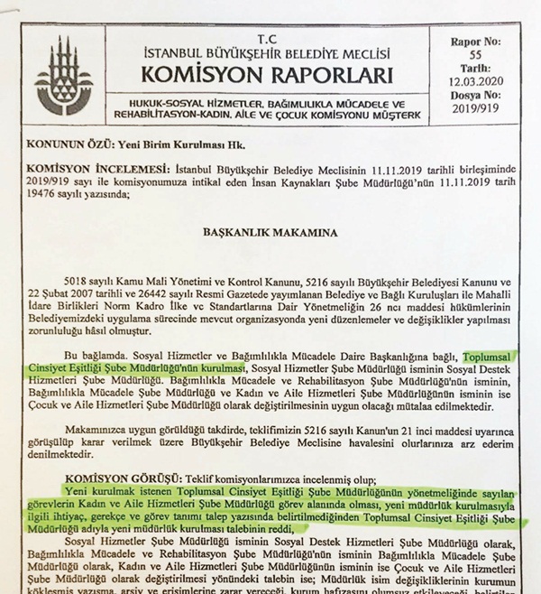 İstanbul Büyükşehir Belediyesi (İBB) CHP grubunun geçtiğimiz aylarda meclis gündemine taşıdığı 'Toplumsal Cinsiyet Eşitliği Şube Müdürlüğü'nün kurulmasına ilişkin karar, Hukuk-Sosyal Hizmetler, Bağımlılıkla Mücadele ve Rehabilitasyon, Kadın Aile ve Çocuk Komisyonu’na havale edilmişti. Komisyon İBB Mart Ayı 2. Bileşeninde kurulması istenen müdürlükle ilgili kararını açıkladı. Hazırlanan raporda, yeni kurulmak istenen Toplumsal Cinsiyet Eşitliği Şube Müdürlüğü’nün yönetmeliğinde sayılan görevlerin Kadın ve Aile Hizmetleri Şube Müdürlüğü görev alanında olduğu belirtilerek yeni müdürlük kurulması talebi reddedildi.