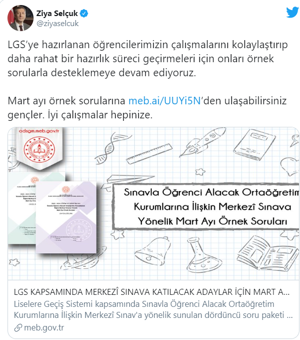 Bakan Ziya Selçuk, LGS Mart ayı örnek sorularının erişime açıldığını bildirirken "LGS’ye hazırlanan öğrencilerimizin çalışmalarını kolaylaştırıp daha rahat bir hazırlık süreci geçirmeleri için onları örnek sorularla desteklemeye devam ediyoruz." ifadelerini kullandı.