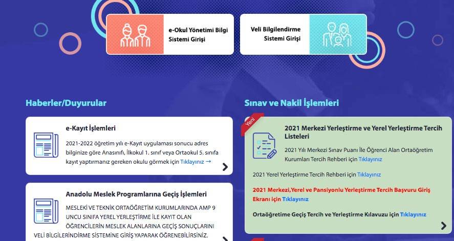 Sınava giren ve merkezi sınav puanına sahip öğrenciler dahil tüm öğrenciler yerel yerleştirme ile öğrenci alan okul tercihinde bulunmak zorunda olacak. Yerel yerleştirme ile öğrenci alan okullar ekranından tercih yapılmaması durumunda, öğrencilere merkezi sınavla öğrenci alan okullar ile pansiyonlu okullar tercih ekranı açılmayacak. 2021 LGS tercihleri e okul için tıklayın