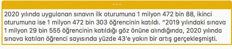 MEB'den yapılan açıklamaya göre; şubat ayı örnek soruları ile beraber bugüne kadar 970 örnek soru 8'inci sınıf öğrencileri ile paylaşılmış oldu. Şubat ayı örnek sorularında, Türkçe, matematik, fen bilimleri alanlarından 10'ar, T.C. İnkılap Tarihi ve Atatürkçülük, din kültürü ve ahlak bilgisi ile İngilizce alanlarından 5'er soru olmak üzere toplam 45 soru yer aldı. Örnek soruların, 6 Haziran 2021'de gerçekleştirilecek LGS'ye yönelik olarak öğrencilere destek sağlamak amacıyla her ay yayımlanmaya devam edeceği bildirildi.