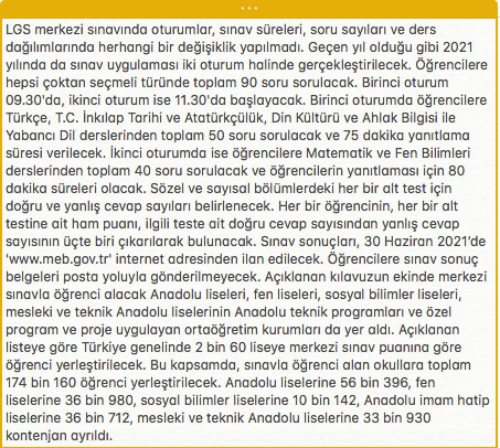 Milli Eğitim Bakanlığı (MEB), Liselere Geçiş Sistemi (LGS) kılavuzunu yayımladı. LGS kapsamında 6 Haziran 2021’de uygulanacak merkezi sınavın başvuruları, 5-14 Nisan 2021 arasında Bakanlık tarafından merkezi olarak gerçekleştirilecek. Sınavda oturumlar, sınav süreleri, soru sayıları ve ders dağılımlarında ise herhangi bir değişiklik yapılmadı.
