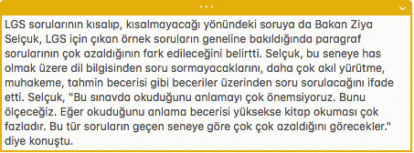 LGS kapsamında sınavla öğrenci alacak ortaöğretim kurumlarına ilişkin merkezi sınava yönelik sunulan dördüncü soru paketi ile paylaşılan soru sayısı 1000'i aştı. Mart ayı örnek soruları ile bugüne kadar 1015 örnek soru, 8. sınıf öğrencilerinin erişimine açılmış oldu.