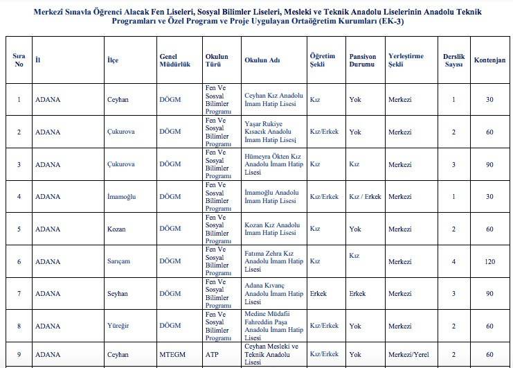Lise kontenjanları için tıklayın