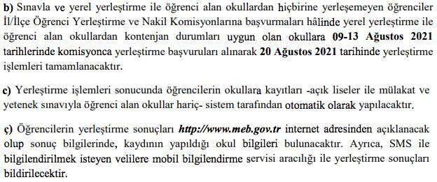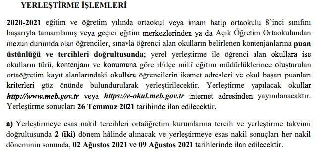 Açık Öğretim Ortaokulu öğrencilerinin yerleştirme işlemleri, yerel yerleştirme ile öğrenci alan okullar için e-Okul sisteminde açılan tercih sisteminde tercih yapamayacak olup, yerleştirme talebinde bulunmaları hâlinde, ikamet adresleri dikkate alınarak İl/İlçe Öğrenci Yerleştirme ve Nakil Komisyonlarınca 09-13 Ağustos 2021 tarihlerinde yapılacaktır.