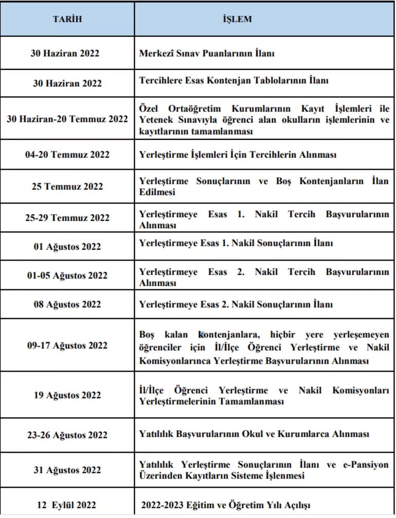Yerleştirme sonuçlarının açıklanması ile aynı zamanda MEB tarafından boş kontenjanlar ilan edilecek. 25-29 Temmuz tarihleri arasında yerleştirmeye esas 1. nakil tercih başvuruları alınacak. Nakil sonuçları 1 Ağustos'ta açıklanacak.