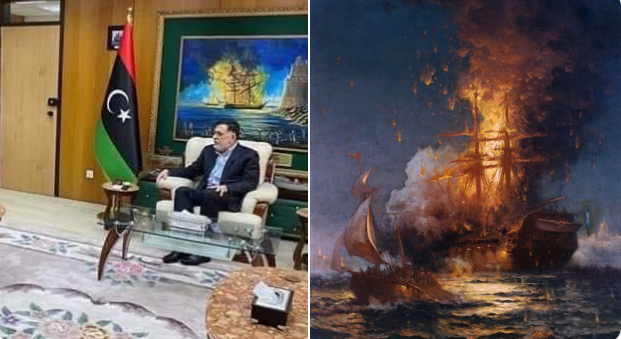 Sarrac, Alman büyükelçisini karşılarken Batı'ya bomba bir mesaj verdi. Tabloda, Libyalılar tarafından batırılan Philadelphia gemisinin yanmış resmi yer alıyor.