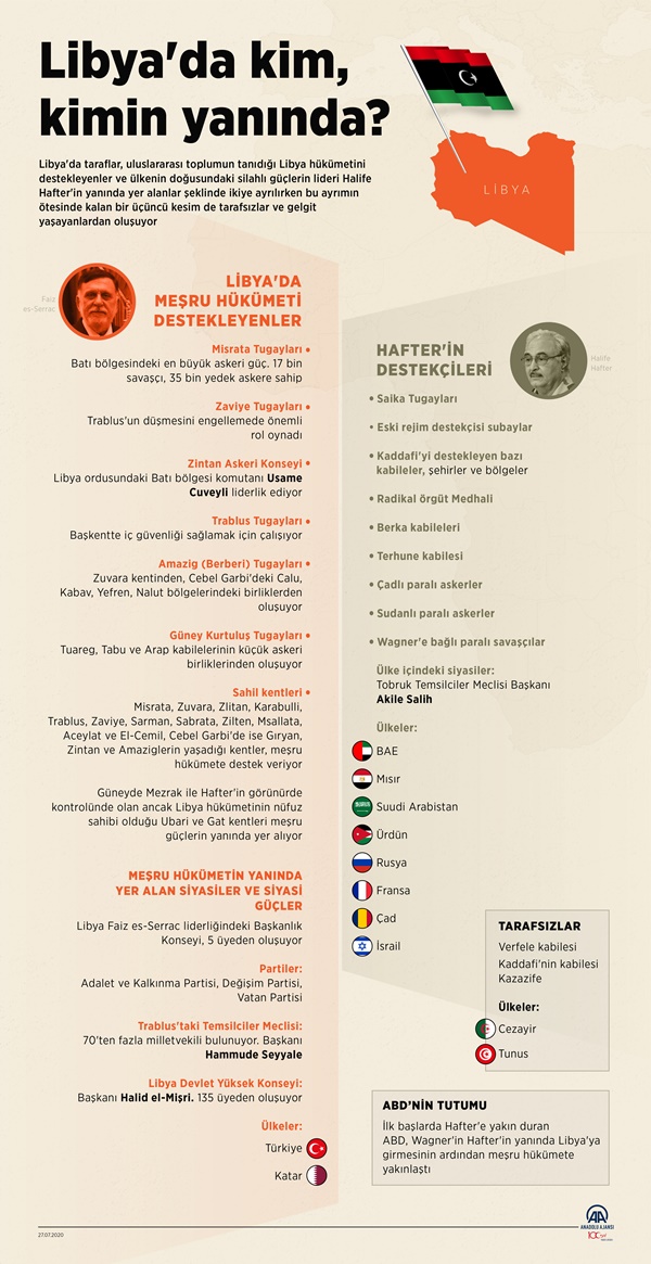 Libya'da taraflar, uluslararası toplumun tanıdığı Libya hükümetini destekleyenler ve ülkenin doğusundaki silahlı güçlerin lideri Halife Hafter'in yanında yer alanlar şeklinde ikiye ayrılırken bu ayrımın ötesinde kalan bir üçüncü kesim de tarafsızlar ve gelgit yaşayanlardan oluşuyor.