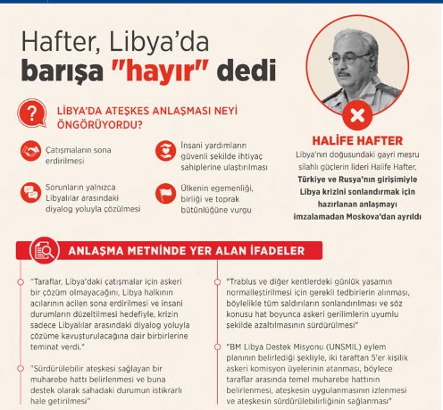 Rusya Dışişleri Bakanlığı, Hafter’in, ateşkes görüşmelerinin ardından oluşturulan anlaşmayı imzalamadan Moskova'dan ayrıldı. Rusya Dışişleri Bakanlığı, Libya'nın doğusundaki gayrimeşru silahlı güçlerin darbeci lideri Hafter’in, ateşkes görüşmelerinin ardından oluşturulan anlaşmayı imzalamadan başkent Moskova'dan kaçtı. Bakanlıktan Rus haber ajansı TASS’a yapılan açıklamada, Hafter'in, Ulusal Mutabakat Hükümeti (UMH) Başbakanı Fayiz es-Serrac'ın kabul ettiği anlaşmayı imzalamadan, Moskova'dan gece saatlerinde ayrıldığı belirtildi. Açıklamada, Rusya’nın Libya’da taraflar arasındaki çalışmalarını ise sürdürdüğü kaydedildi. Türk ve Rus heyetler ile Libya’daki taraflar arasında dün Moskova'da görüşmeler gerçekleştirilmişti. Türk heyeti, Serrac ve Libya Devlet Yüksek Konseyi Başkanı Halid el-Mişri ile anlaşma metnini oluşturmuştu. Rus heyeti ise Hafter ve Tobruk merkezli Temsilciler Meclisi'nin Başkanı Akile Salih’i ikna etmeye çalışmıştı. Ancak Hafter, uzun uğraşlar neticesinde oluşturulan anlaşma metnini imzalamamış ve sabaha kadar süre istemişti.