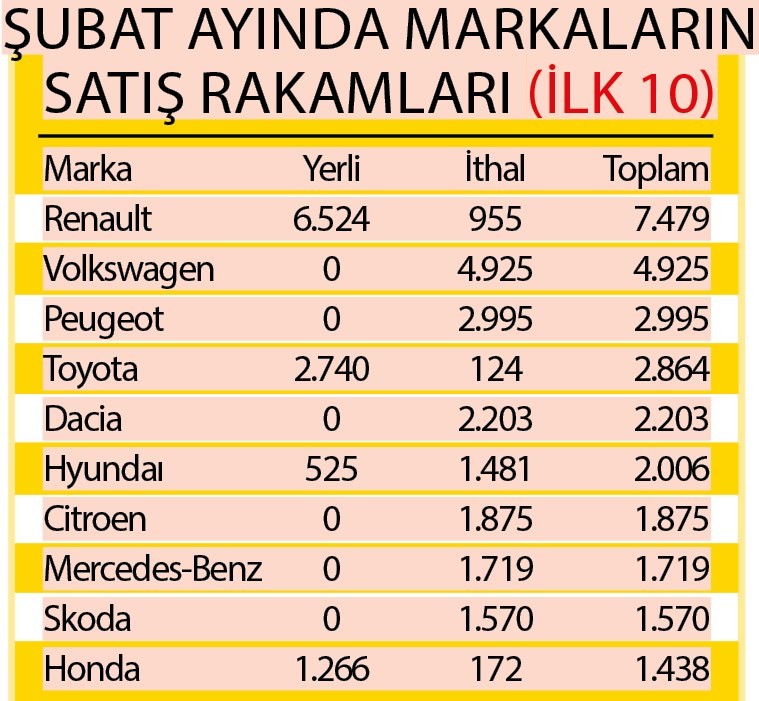 Türkiye otomobil ve hafif ticari araç toplam pazarda bu yılın şubat ayında en fazla satış yapan marka Renault oldu. Yıla iyi bir başlangıç yapan otomotiv pazarında, Türkiye’de üretim yapan Renault, bu ay 7 bin 479 adet satışla liderliği Alman otomobil üreticisi Volkswagen’den alarak ilk sıraya yerleşti.