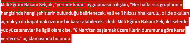 15 Şubat’ta Milli Eğitim Bakanlığına (MEB) bağlı köy okulları ve ana okulları yüze yüze eğitime başladı. 1 Mart'tan itibaren ise illerin risk durumuna göre, mavi ve sarı renkli illerde tüm sınıflar yüz yüze eğitime başlarken, turuncu ve kırmızı renkli illerde ise ilkokul 1, 2, 3, 4'üncü sınıf öğrencilerimizle 8 ve 12'nci sınıf öğrencilerimiz de yüz yüze eğitimlerine başladı, diğer sınıflar bu illerde uzaktan eğitime devam ediyor.