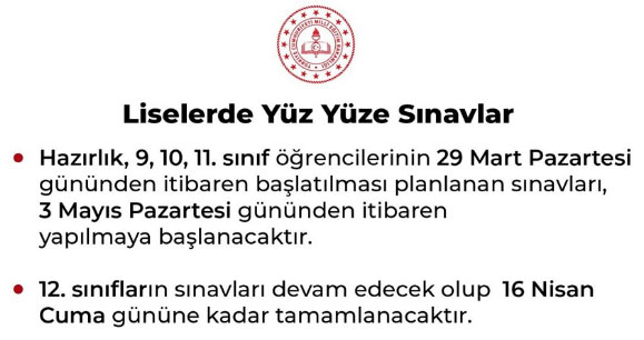Buna göre, liselerde hazırlık, 9, 10, 11. sınıf öğrencilerinin yapılmakta olan sınavları 26 Mart'a kadar tamamlanacak. Liselerde hazırlık, 9, 10, 11. sınıf öğrencilerinin 29 Mart Pazartesi gününden itibaren başlatılması planlanan sınavları, en erken 3 Mayıs Pazartesi gününden itibaren yapılmaya başlanacak.