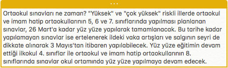 Milli Eğitim Bakanlığı illerin milli eğitim müdürlüklerine yüz yüze sınavlara ilişkin yazı gönderdi. İllere gönderilen yazıda, liselerdeki yüz yüze sınav uygulamalarına ilişkin açıklamalara yer verildi. MEB taraından gönderilenyazıda, korona salgınının yayılımının önlenmesi ve halk sağlığının korunması amacıyla Cumhurbaşkanlığı Kabinesi tarafından alınan kararlar doğrultusunda düşük, orta, yüksek ve çok riskli olarak sınıflandırılan illerde son günlerde yaşanan vaka sayılarındaki artış ve salgının seyrindeki gelişmelerin göz önünde bulundurulduğu ve bu kapsamda liselerde yüz yüze sınav tarihlerine ilişkin yeni uygulamaların yapılacağı ifade edildi.