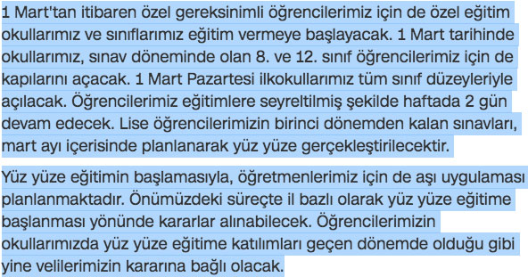 Milli Eğitim Bakanı Ziya Selçuk, yüz yüze eğitime geçiş sürecinin ayrıntılarına ilişkin basın açıklaması yaptı. Bakan Selçuk, yüz yüze sınavlarına ilişkin de öğrencilerin merakını giderdi. Bakan Selçuk, “15 Şubat'ta tüm bağımsız anaokullarımızı da yüz yüze açma kararı verdik. İlkokullarımız seyreltilmiş şekilde haftanın iki günü devam edecekler. 8. ve 12. sınıflar 1 Mart'ta tam zamanlı başlayacak, Bilim Kurulu'nun öngördüğü şekilde sınıflarında yerlerini alacaklar. Lise öğrencilerimizin sınavları Mart'ta yapılacak.” dedi. Bakan Selçuk şunları söyledi:
