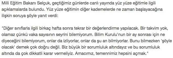 Milli Eğitim (MEB) Bakanı Ziya Selçuk ortaöğretim ve lise okulların ne zaman açılacağına ilişkin olarak yaptığı açıklamada, anasınıfı ve ilkokul birinci sınıf öğrencilerinin yüz yüze eğitimin başlamasından 3 hafta sonra anasınıfı, ilkokul birinci sınıf öğrencileri ile 8, 9 ve 12. sınıflar için yeniden değerlendirme yapılacak. Değerlendirmeler sonucunda lise ve ortaokulların okula başlayıp başlamayacağı da belli olacak.